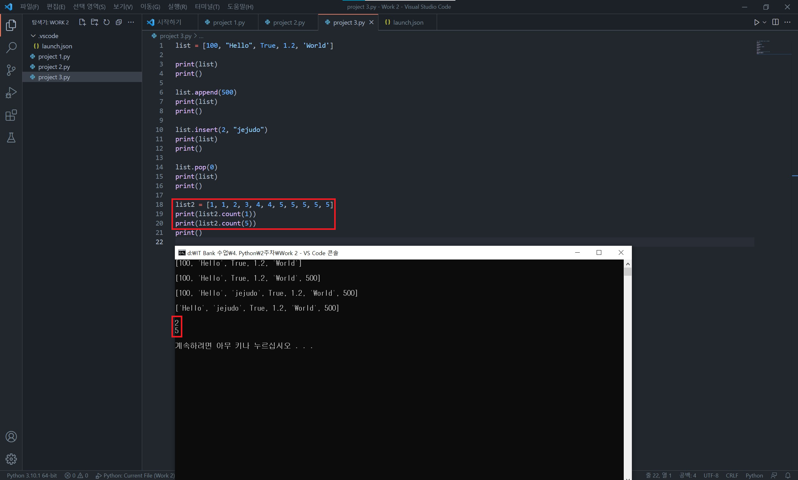 리스트명.count(자료) 형식으로 작성해 주면 리스트 안에서 해당 자료의 개수를 세어주게 됩니다.