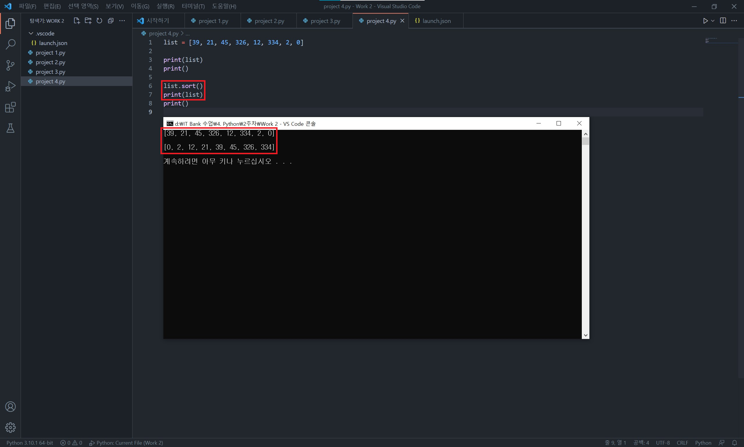sort() 함수는 리스트의 자료들을 오름차순으로 정렬해 주는 함수입니다.
