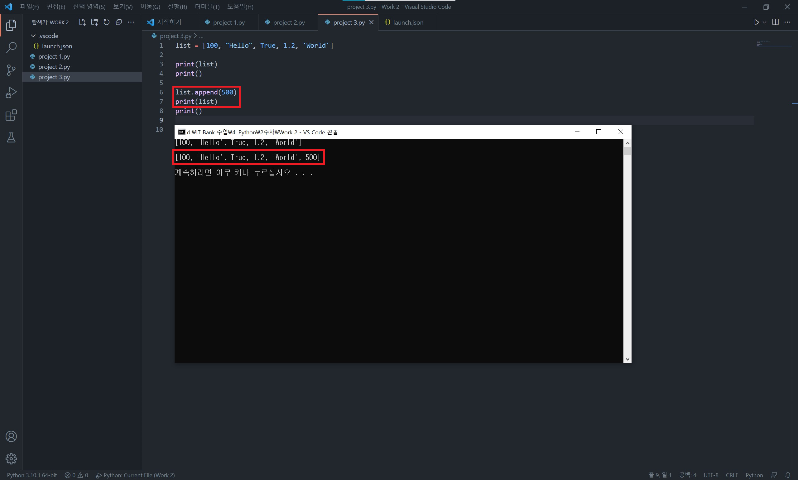 리스트명.append(자료) 형식으로 작성해 주면 해당 자료를 리스트의 가장 마지막에 추가해 줍니다.