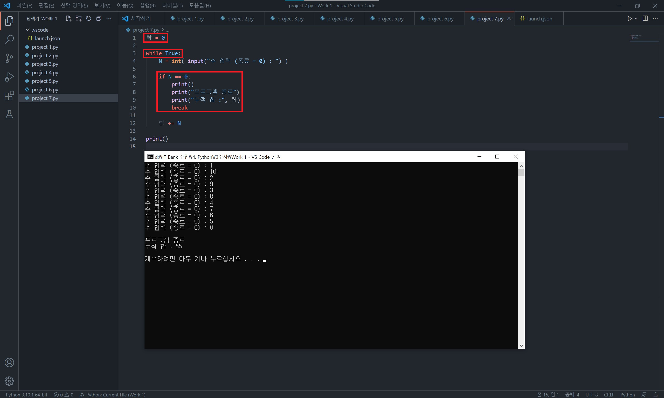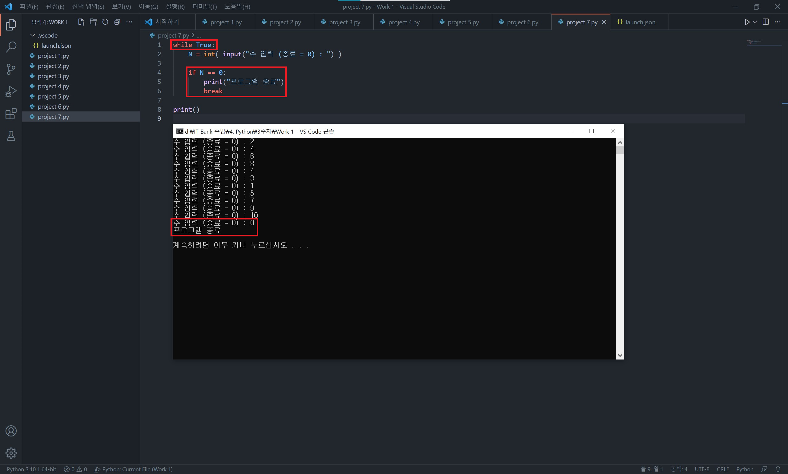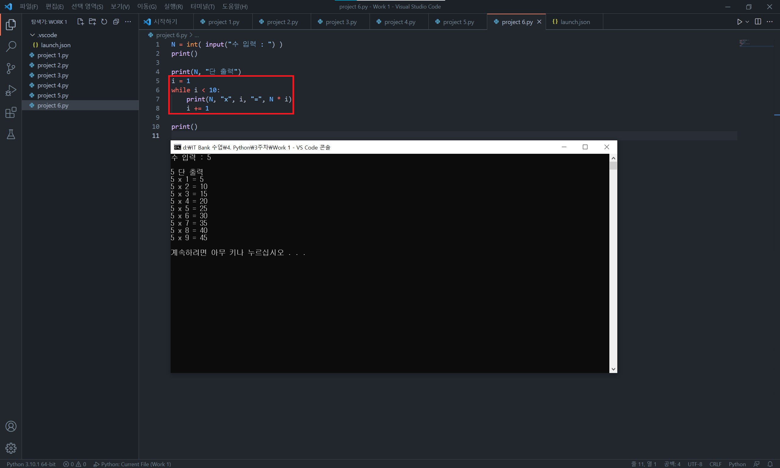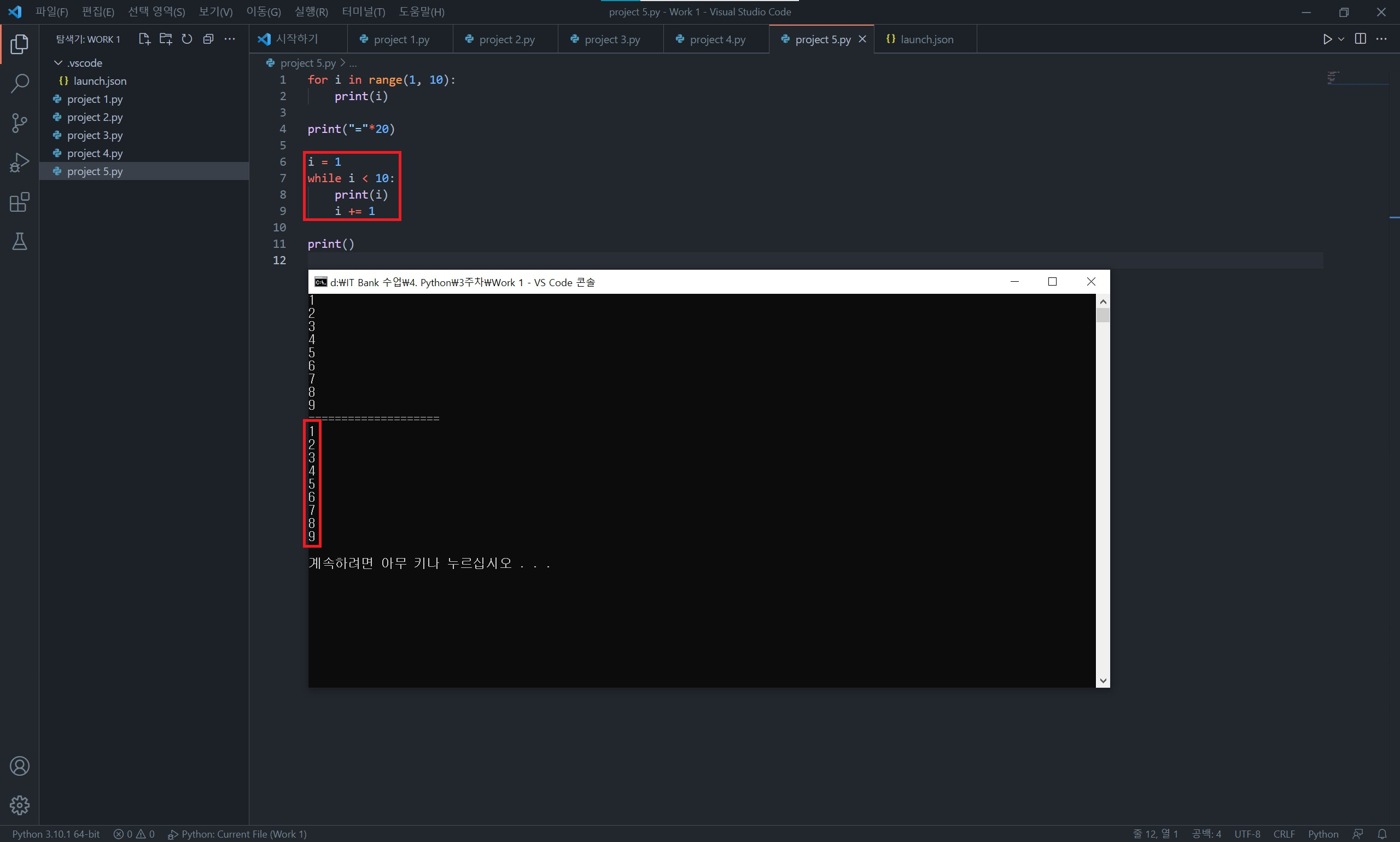 while 반복문은 while 조건식 : 종속 문장 형식으로 작성하며, 조건식의 결과는 bool 값으로 도출되어야 합니다.