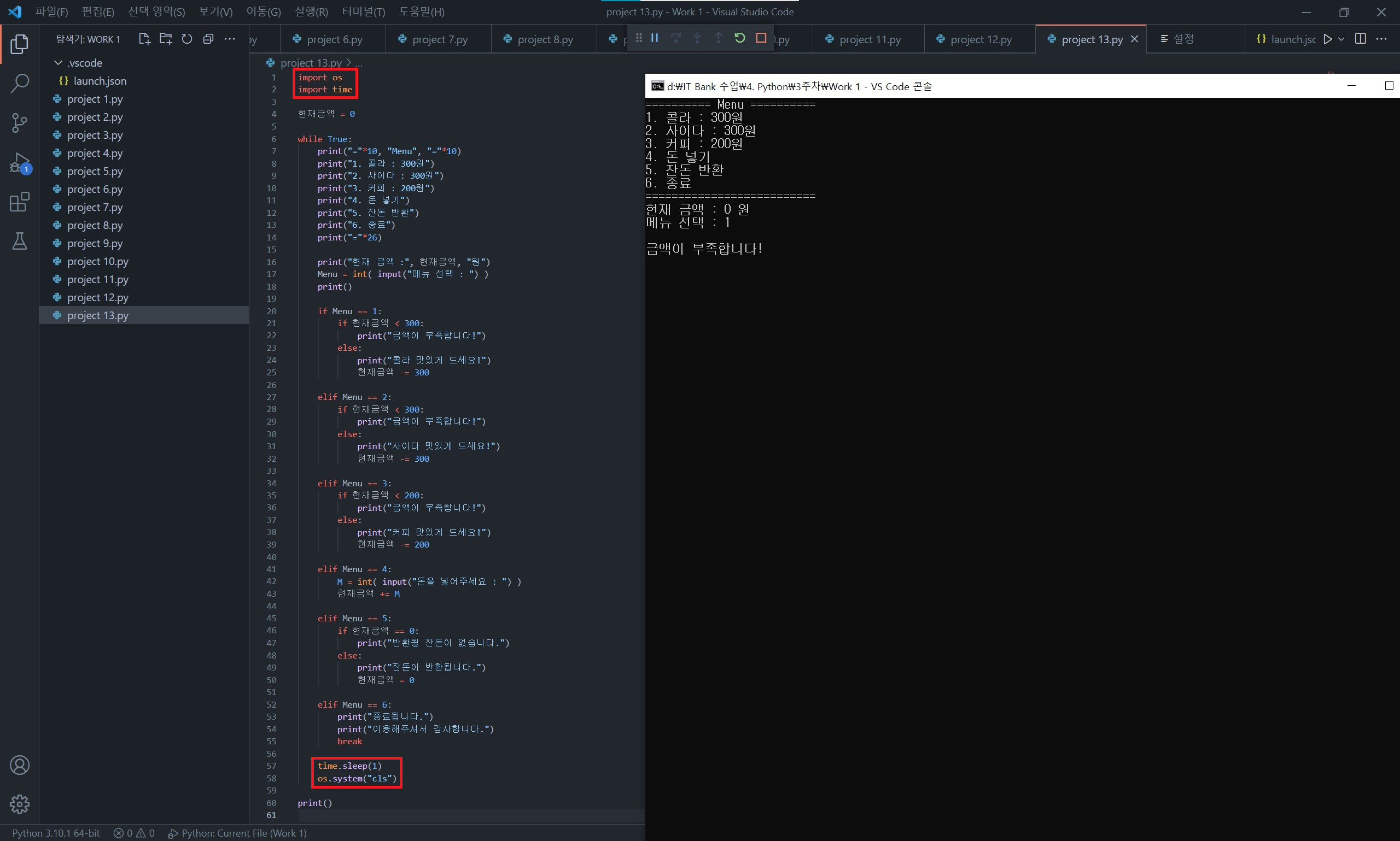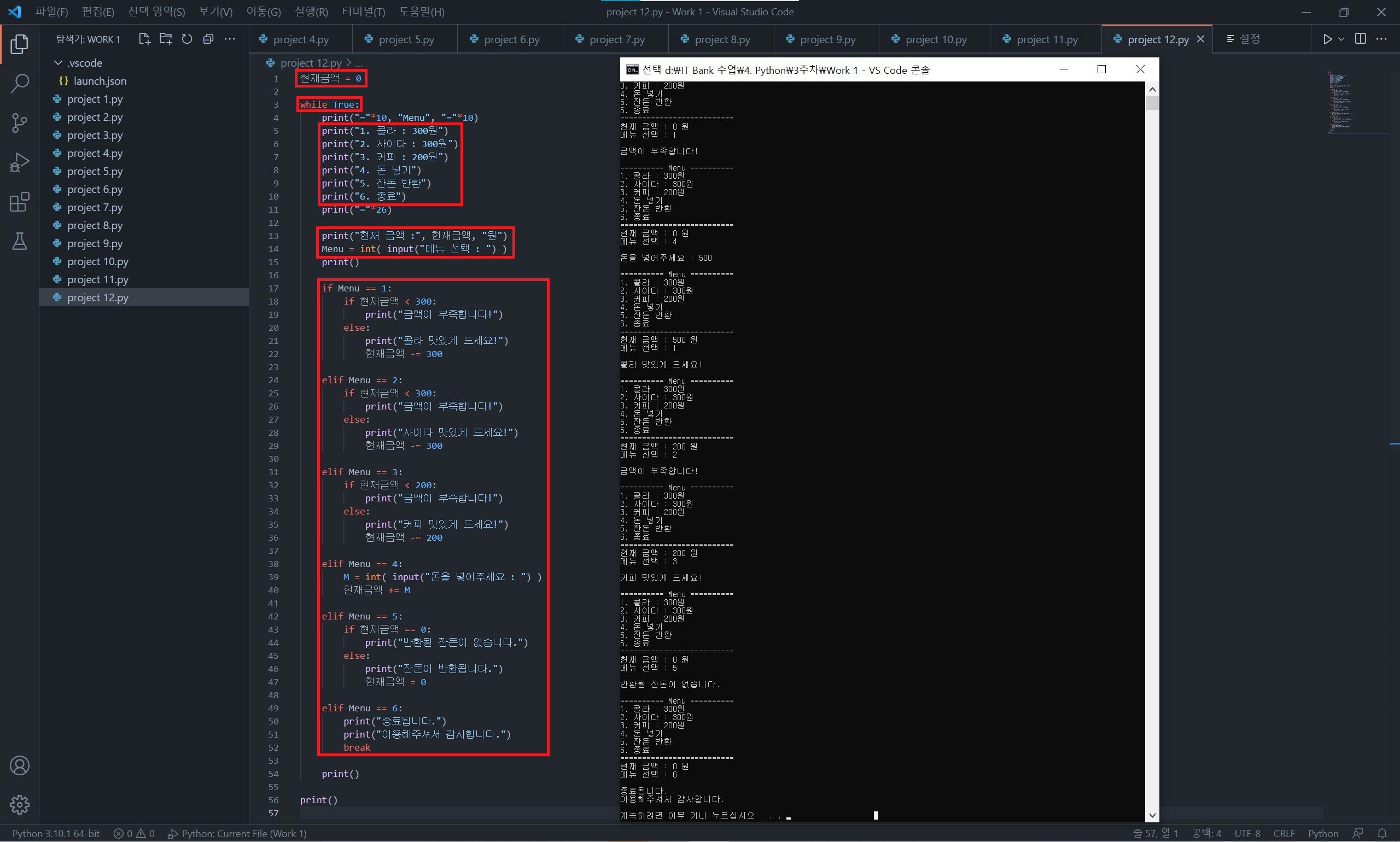 while 문과 if 문을 활용하여 자판기를 간단하게 구상해 본 예시입니다.