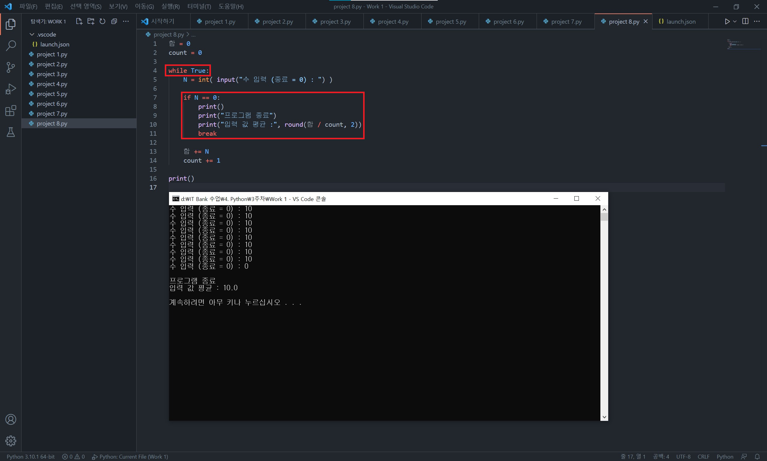 실제로 코딩을 할 때는 while 문의 조건식에 조건식을 사용하는 것보다 True를 적어주어 무한 반복문으로 만들어 사용하는 일이 더 많습니다. 무한 반복문으로 진행되면 반복문 내부에서 조건문을 사용하여 break 문을 활용해 반복문을 탈출하도록 만들어 줄 수 있습니다.