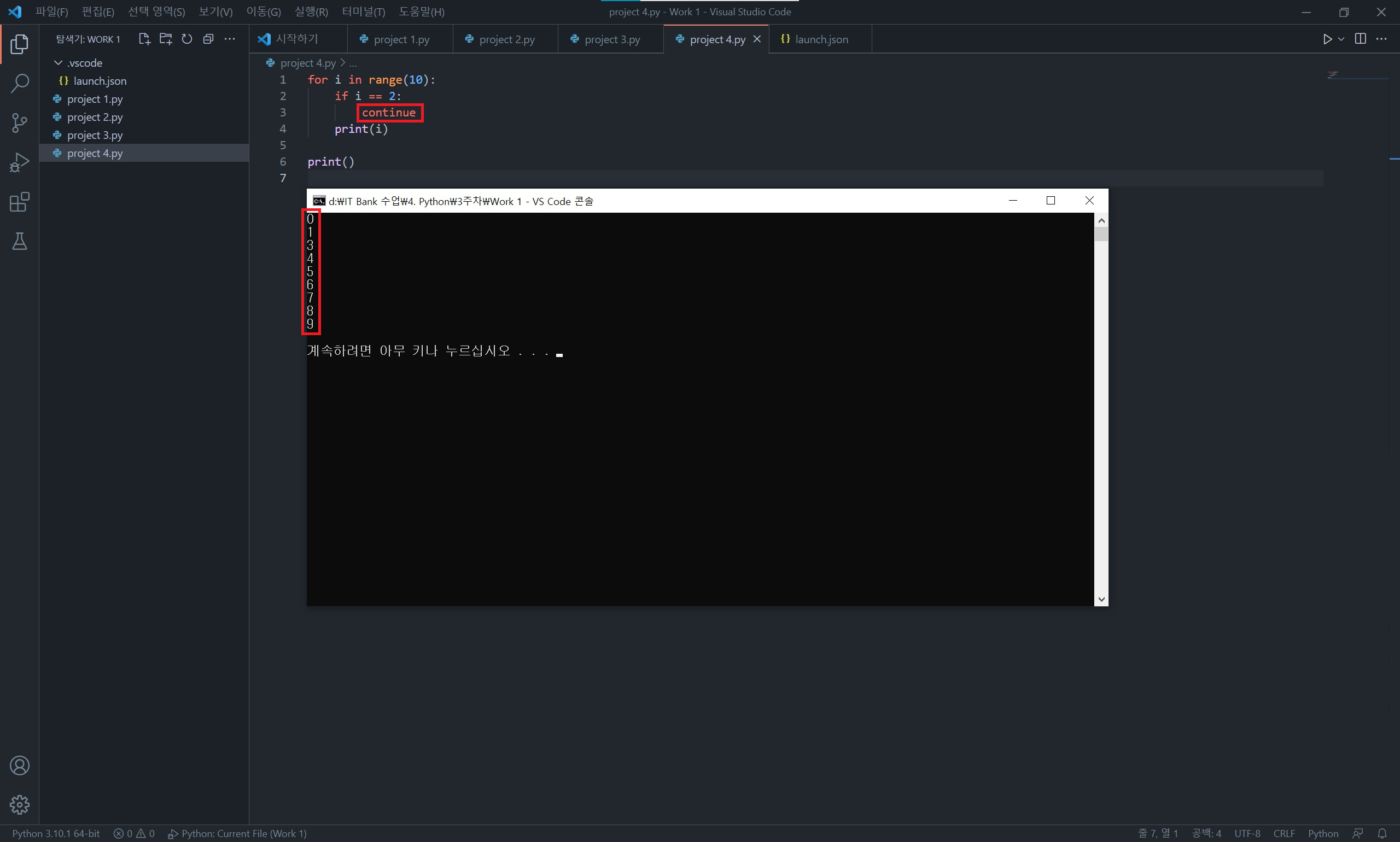 continue 문은 반복문을 계속 진행한다는 의미인데, continue 문을 만나면 이후 문장들은 모두 생략하고 다시 for 문으로 돌아가게 됩니다.