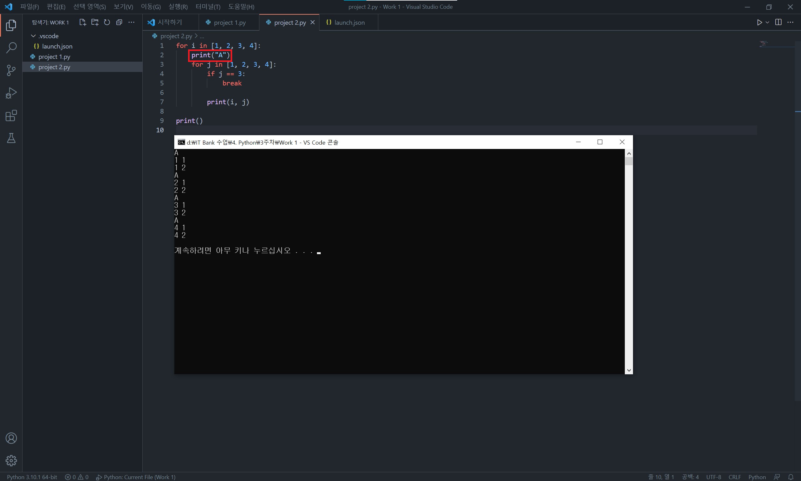 바깥쪽 반복문이 1회 실행될 때, 안쪽 반복문이 전체 1회 실행됩니다.