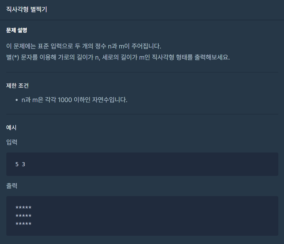입력받은 가로의 길이와 세로의 길이 중 각 세로의 길이별 가로의 길이만큼 별을 각 줄에 찍어주도록 구현한다.