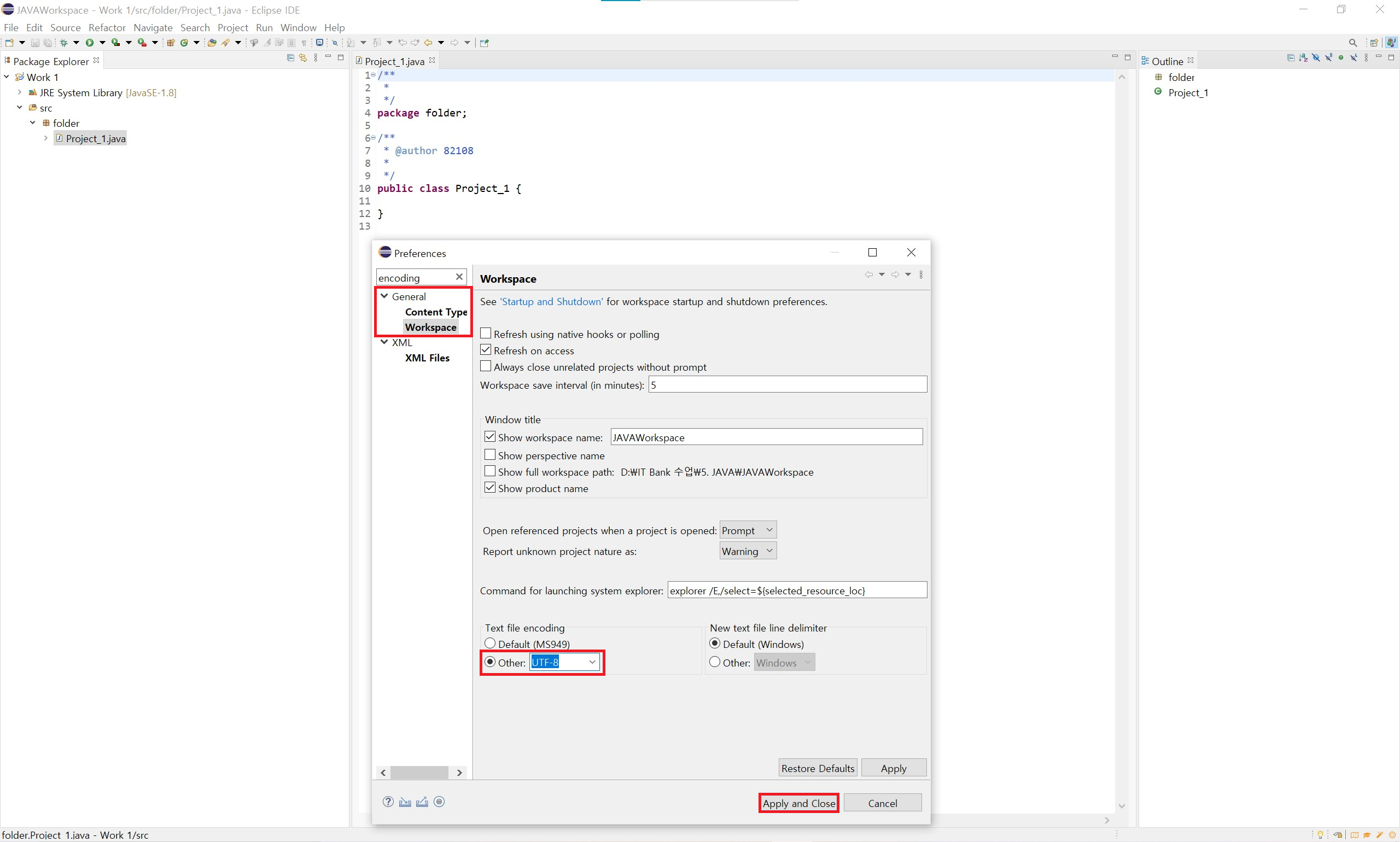 마지막으로 window 설정 preferences에 들어가 Workspace Text file encoding 설정 UTF-8로 바꿔주면 Java를 공부할 준비가 끝나게 됩니다.