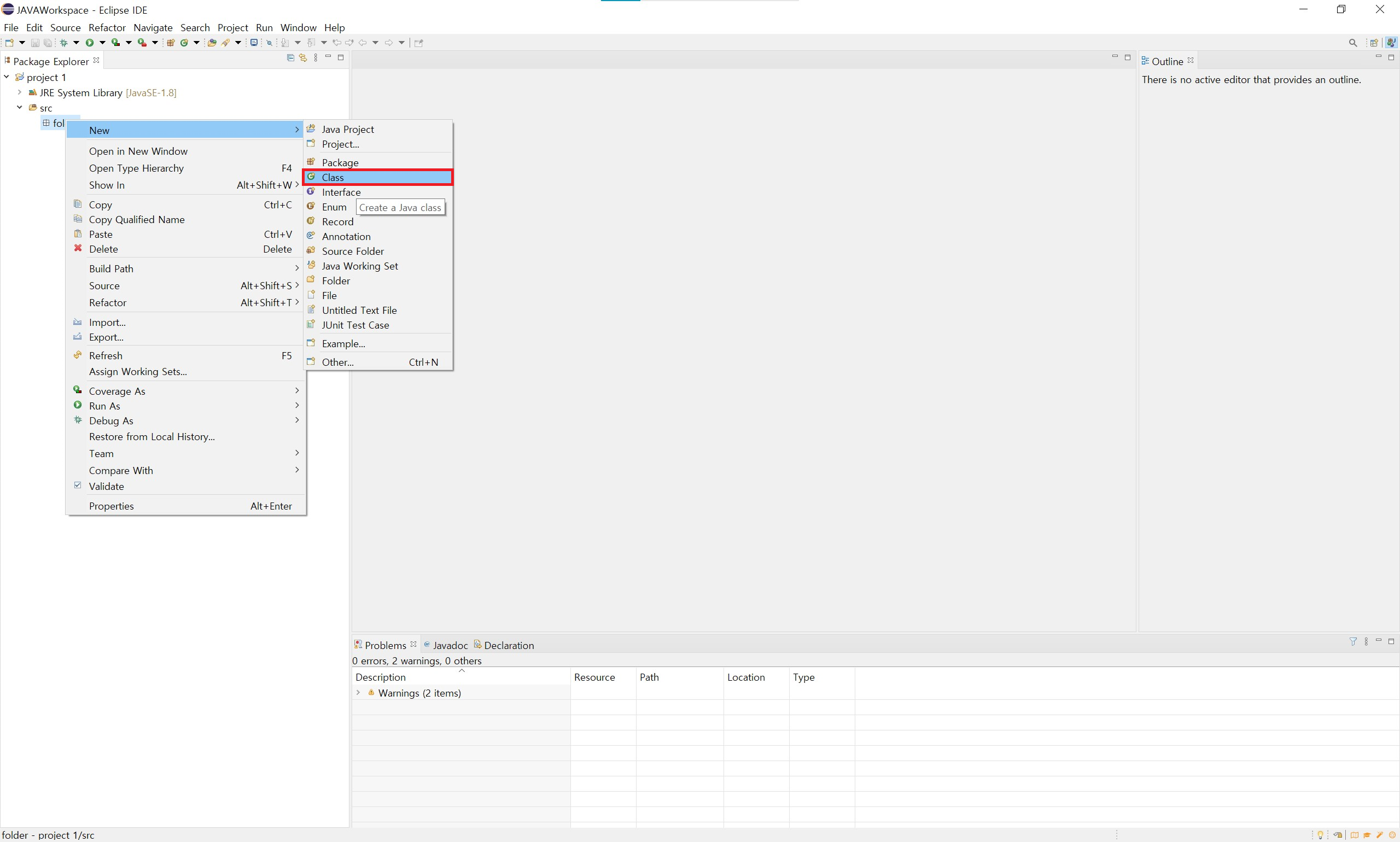 생성해 준 Package 안에 Class를 만들어주면 프로그램의 기본 틀이 생성됩니다.