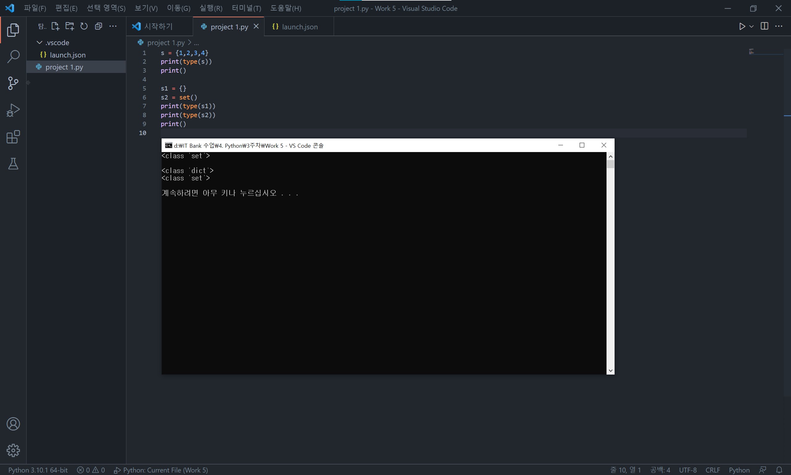 공백의 세트를 생성할 때는 set() 함수를 사용하여 생성해 줍니다. 그냥 { }를 빈 상태로 두면 딕셔너리로 인식하게 됩니다.