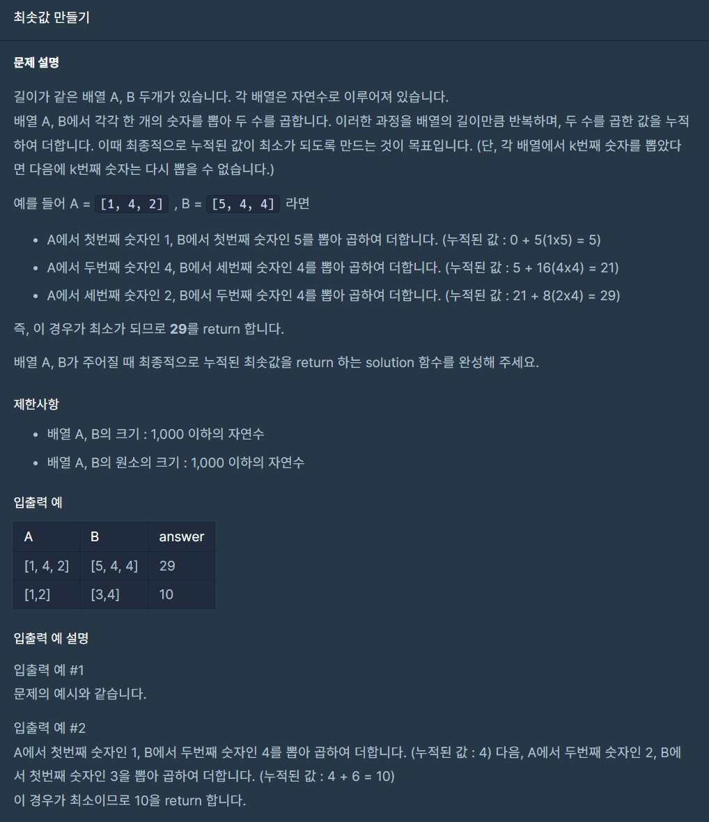- 각 배열의 동일한 위치에 있는 원소끼리 곱하여 누적합에 더해준다. answer += A[i] * B[i]