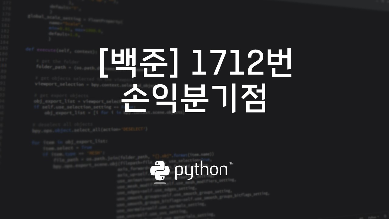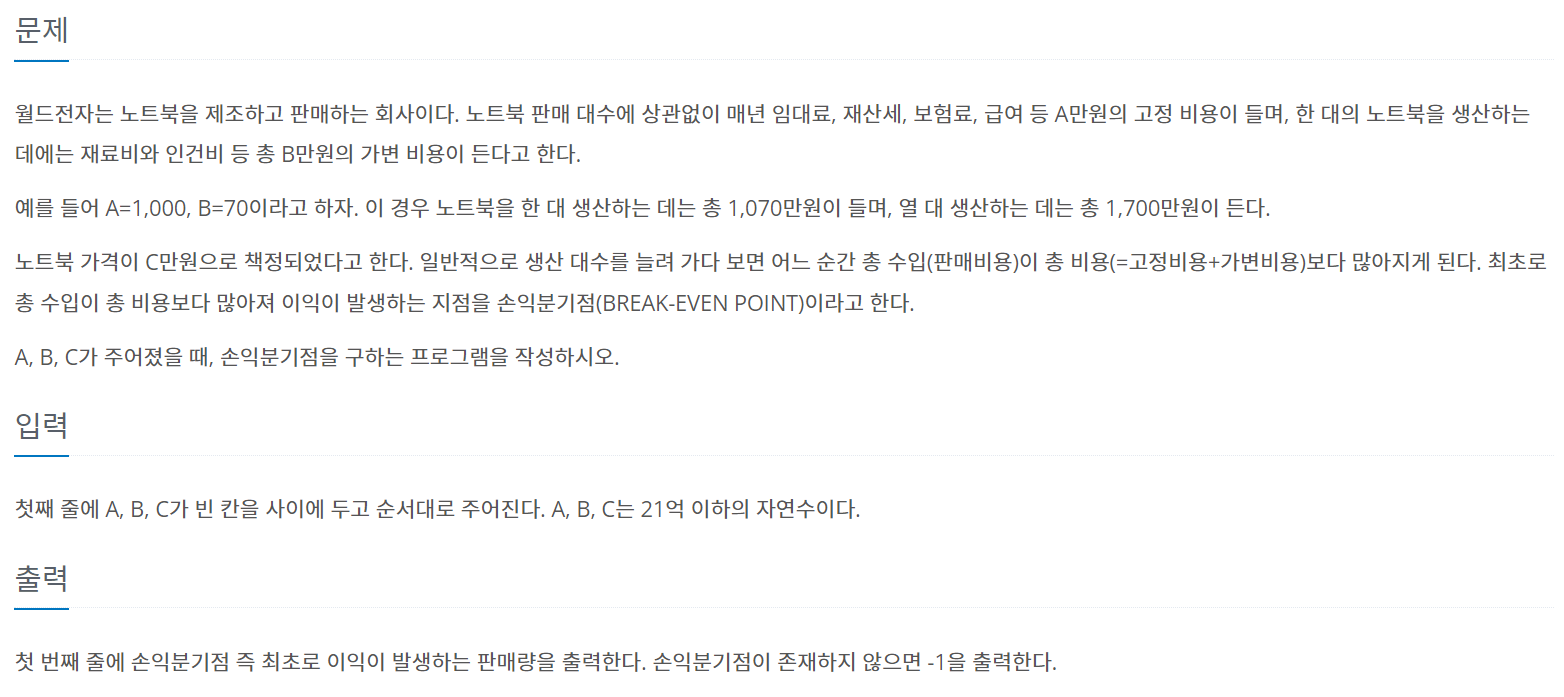 - 손익분기점을 계산하여 값을 출력한다. print(A // (C - B) + 1)