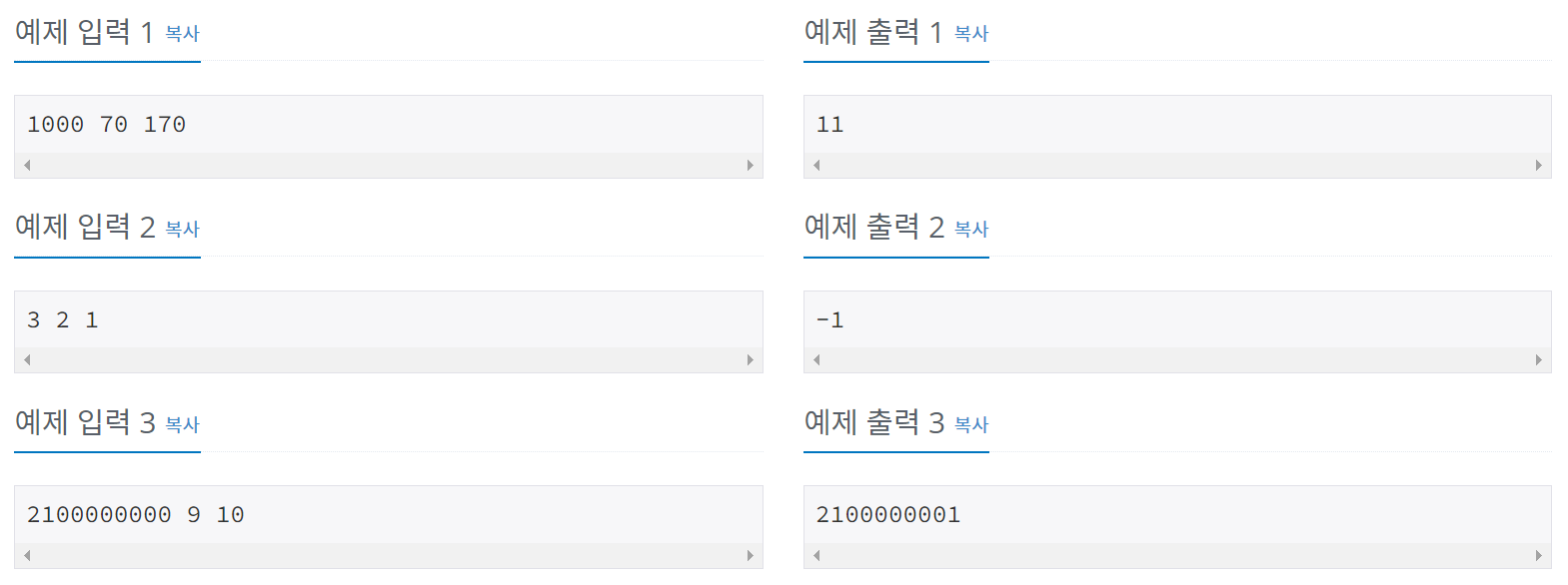 - 아니면 손익분기점이 존재하지 않으므로 -1을 출력한다. else: print(-1)