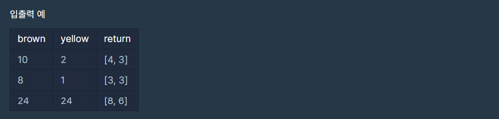 - 노란색 카펫의 모양이 정해진 경우이므로 그 주변으로 갈색 카펫을 배치하여 개수가 동일하면 된다. 따라서 노란색 카펫의 가로의 길이 * 2와 노란색 카펫의 세로의 길이 * 2를 더하고 네 뒤퉁이 4칸을 더해준 결과가 갈색 카펫의 개수와 일치하면 if (brown == (yellow // i * 2) + (i * 2) + 4)