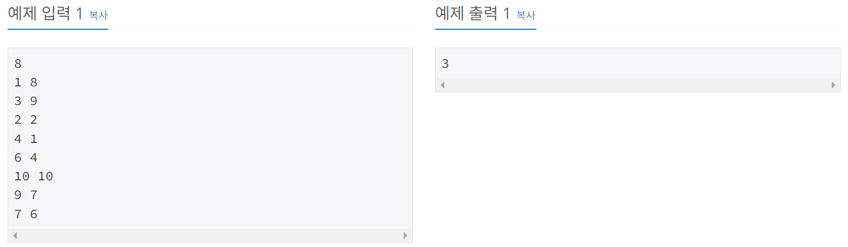 첫째 줄에는 두 전봇대 사이의 전깃줄의 개수가 주어진다. 전깃줄의 개수는 100 이하의 자연수이다. 둘째 줄부터 한 줄에 하나씩 전깃줄이 A전봇대와 연결되는 위치의 번호와 B전봇대와 연결되는